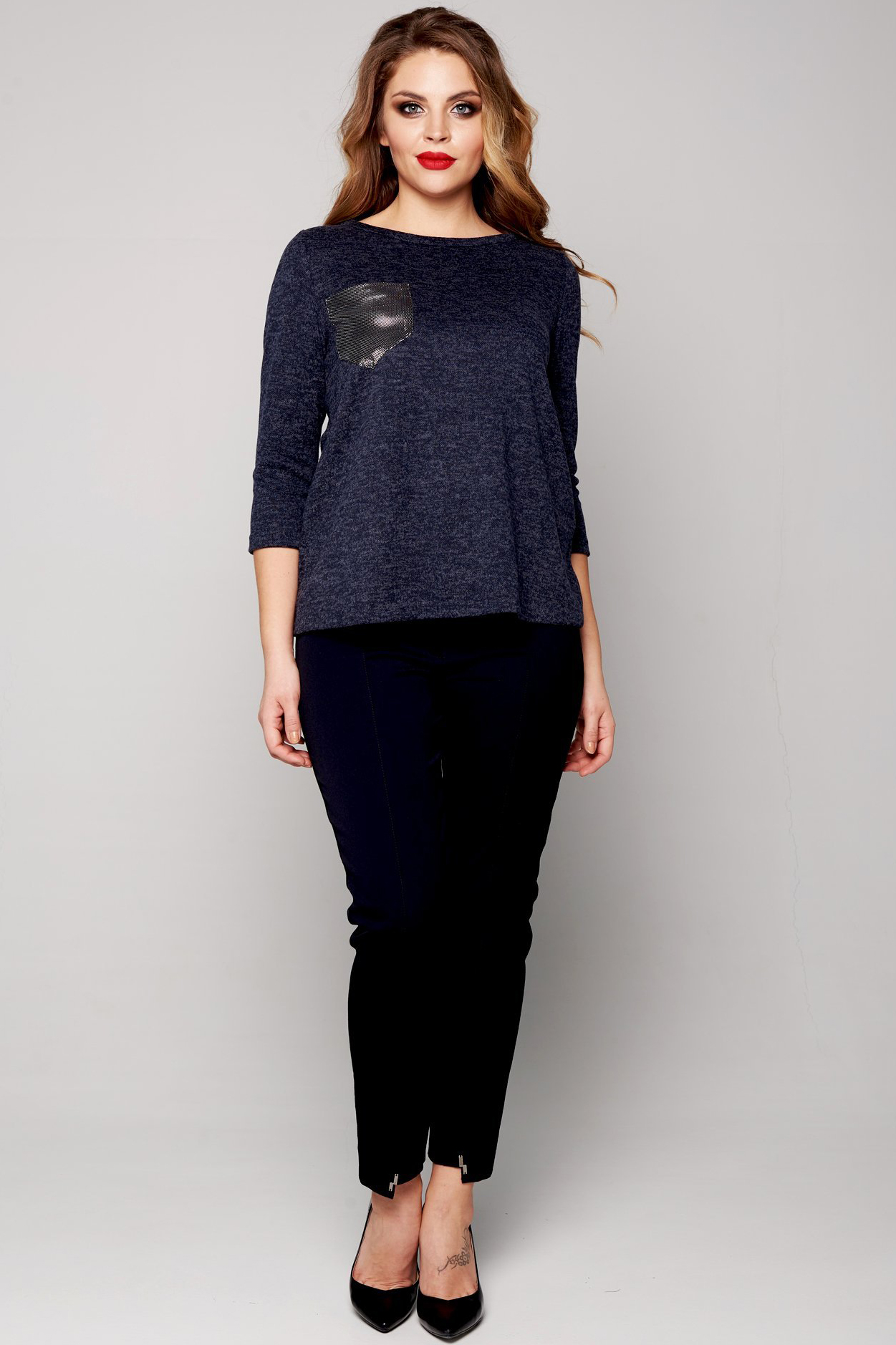 Теплая, уютная трикотажная блуза. Блуза полуприлегающего силуэта, с втачным рукавом и горловиной "лодочка". По линии груди имеется карман из контрастной отделочной ткани.