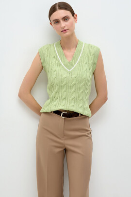 Жилет с V-образным вырезом выполнен в концепте преппи – прилежный, аккуратный и статусный. Модель в свободном, но не слишком объемном крое, из хлопковой пряжи рыхлого фактурного плетения косами. Эти решения позволяют носить жилет и весной, и летом. Гармоничен как соло, так и в комплектах с водолазками, рубашками и футболками. Цветовая схема создана эксклюзивно для CONSO.