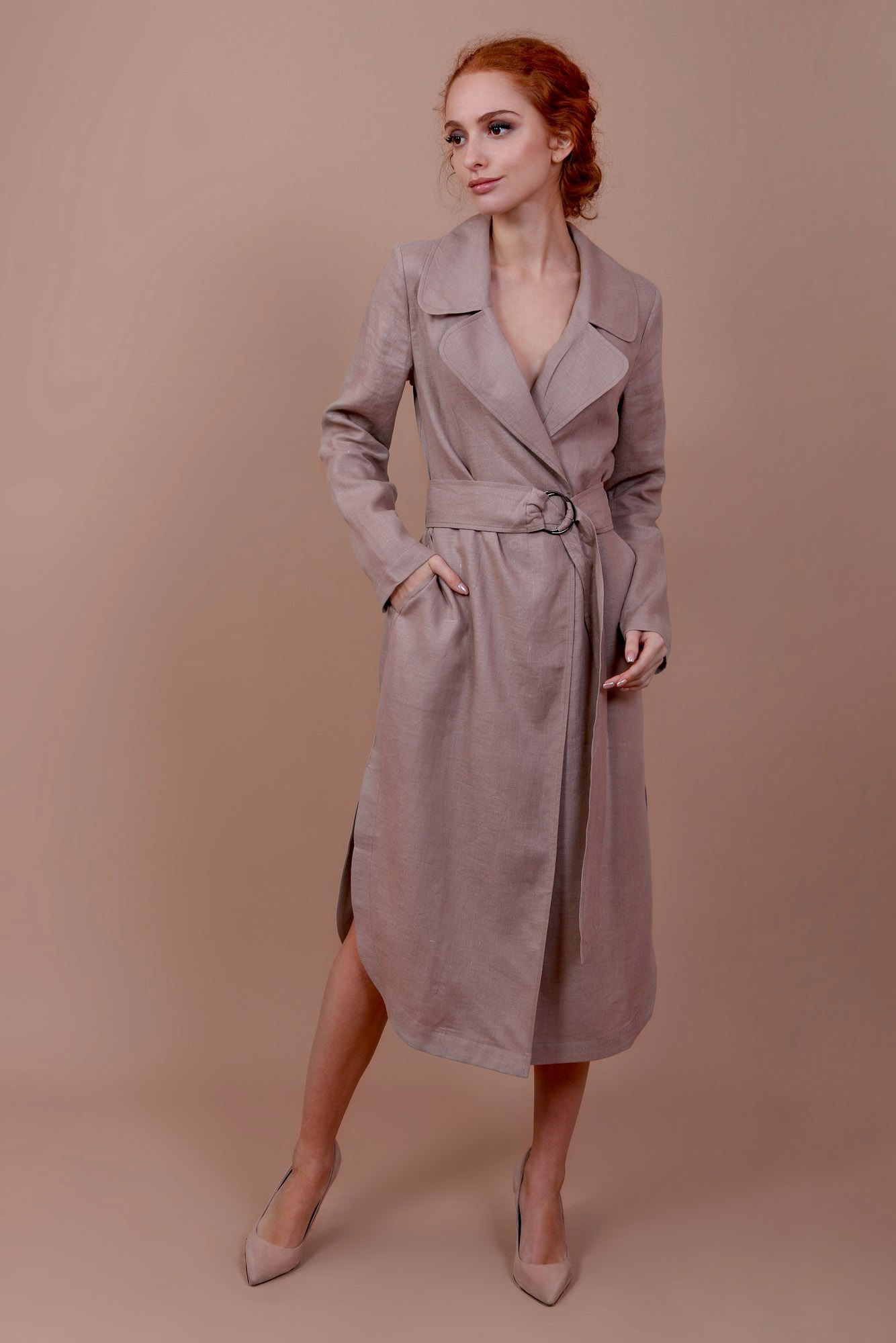 Льняное двубортное платье на запах с поясом и застежкой на потайные кнопки.